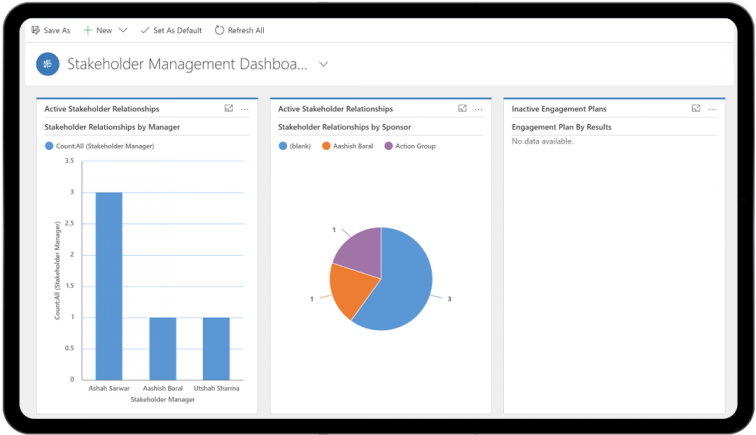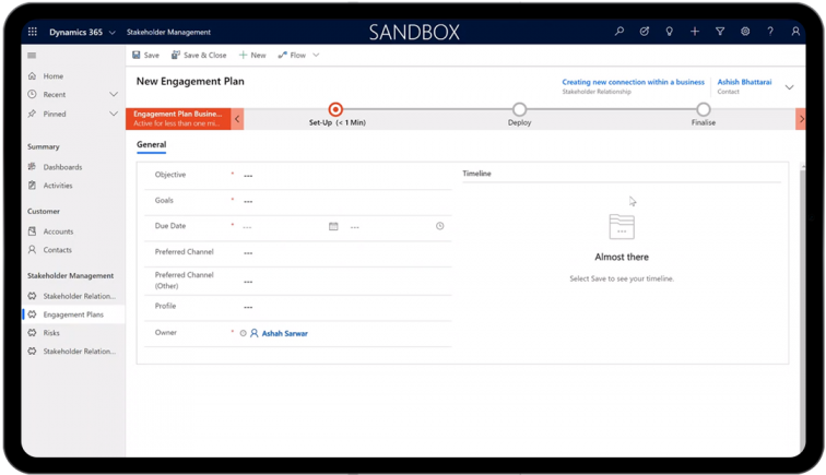 You can set up specific ‘Business Process Flows’ in Dynamics 365, which help you plan engagement activities and execute them effectively. Every interaction with the stakeholder will appear as an activity on your dashboard. This will help you track interactions at each stage of your relationship.